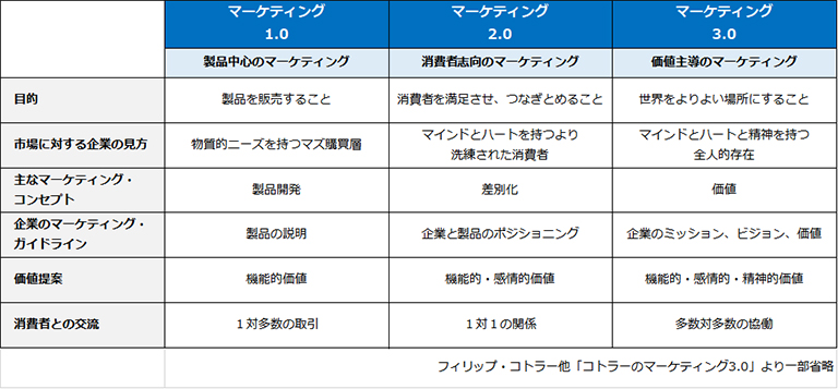 マーケティングの泰斗コトラー博士は、製品そのものを売り込むマーケティングを1.0、消費者志向のマーケティングを2.0、消費者をマインドとハートと精神を持つ存在としてとらえマーケティングを3.0と、それぞれ定義しました。さらにその発展形としてマーケティング4.0を提唱しています。
